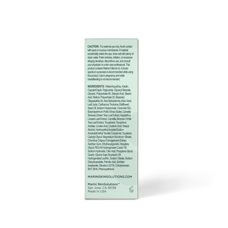 Water/Aqua/Eau, Kaolin, Caprylic/Capric Triglyceride, Glyceryl Stearate, Glycerin, Polysorbate 60, Salicylic Acid, Stearic Acid, Polysorbate 20, Retinol, Bisabolol, Oligopeptide-24, Aloe Barbadensis (Aloe Vera) Leaf Juice, Carthamus Tinctorius (Safflower) Seed Oil, Sodium Hyaluronate, Ceramide 2, Butyrospermum Parkii (Shea) Butter, Camellia Oleifera (Green Tea) Leaf Extract, Aspalathus Linearis Leaf Extract, Camellia Sinensis Leaf Extract, Tocopherol, Tocopheryl Acetate, Linoleic Acid, Linolenic Acid, Stearyl Alcohol, Hydroxyethyl Acrylate/Sodium Acryloyldimethyl Taurate Copolymer, Squalane, Caprylyl Glycol, Magnesium Aluminum Silicate, Carrageenan, Xanthan Gum, Ethylhexylglycerin, Hexylene Glycol, PEG-40 Hydrogenated Castor Oil, Sodium Hydroxide, Citric Acid, Propylene Glycol, Disodium EDTA, Phenoxyethanol